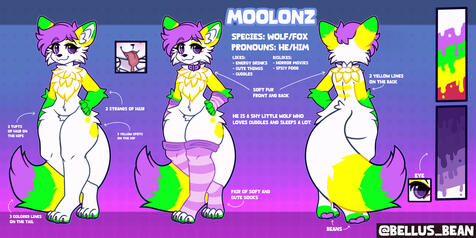 A double-sided flat colour reference sheet of the character at a 3/4 angle with additional info